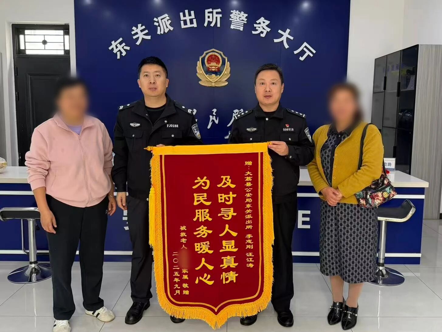 9月底,东关派出所接到辖区群众紧急求助,称80岁的赵大爷在十三厂小区附近走失。接警后,民辅警立即出警处置,一方面依托视频监控系统开展研判,逐帧追踪赵大爷的行动轨迹;另一方面沿可能路线展开地面搜寻,对路边商铺、绿化带等重点区域细致排查,生怕错过任何线索。经过数小时不懈努力,民警最终在西城南村一路边找到浑身是泥的赵大爷。经询问得知,赵大爷当日从家中骑车散步,行至西城南村南边时迷路,情急之下不慎摔倒在路边泥中。三日后,赵大爷家属专程来到东关派出所,将一面印着“及时寻人显真情,为民服务暖人心”的锦旗送到民警手中,以感激民警的及时救助。