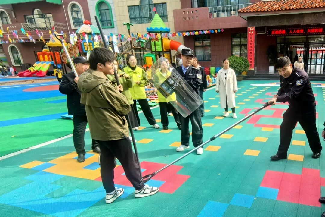 随后,一场紧张的“反恐防暴实战演练”正式展开,一名“歹徒”手持凶器试图闯入校园,学校安保人员迅速启动“一键式报警器”装置报警,同时利用防暴工具全力阻挡歹徒”,接警后,民辅警快速出警赶到现场,使用警棍、盾牌等装备组成“最小作战单元”处置队形,与学校安保人员协作配合,成功将“歹徒”制服并带离。整个过程衔接紧密、反应迅速。通过 “真场景、真操作”,校园安保队伍的协同作战能力和应急反应速度得到显著提升。