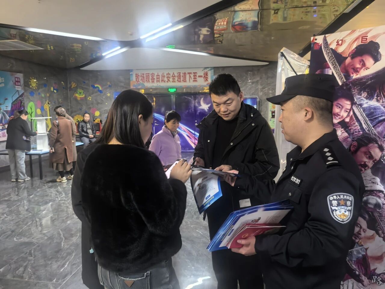 除了深耕校园阵地,东关派出所还将反诈宣传延伸至人流量密集的电影院,让群众在休闲娱乐中学习防骗知识。在影院观影大厅内,民警设立反诈宣传咨询台,抓住观众候场、散场的黄金时段,开展“沉浸式”反诈宣传。