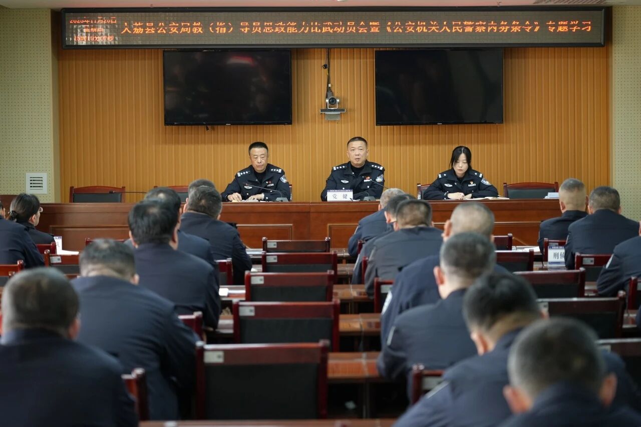 为进一步强化教(指)导员的履职能力,推动思想政治工作更好地服务保障公安工作现代化,按照全市公安机关“精兵•2025”全警实战大比武工作要求,11月20日,大荔县公安局组织召开教(指)导员思政能力比武动员会暨《公安机关人民警察内务条令》专题学习。局党委委员、副局长党健作动员讲话,警务督察大队大队长王小江带领大家集中学习《公安机关人民警察内务条令》,各室所队教(指)导员参加会议。