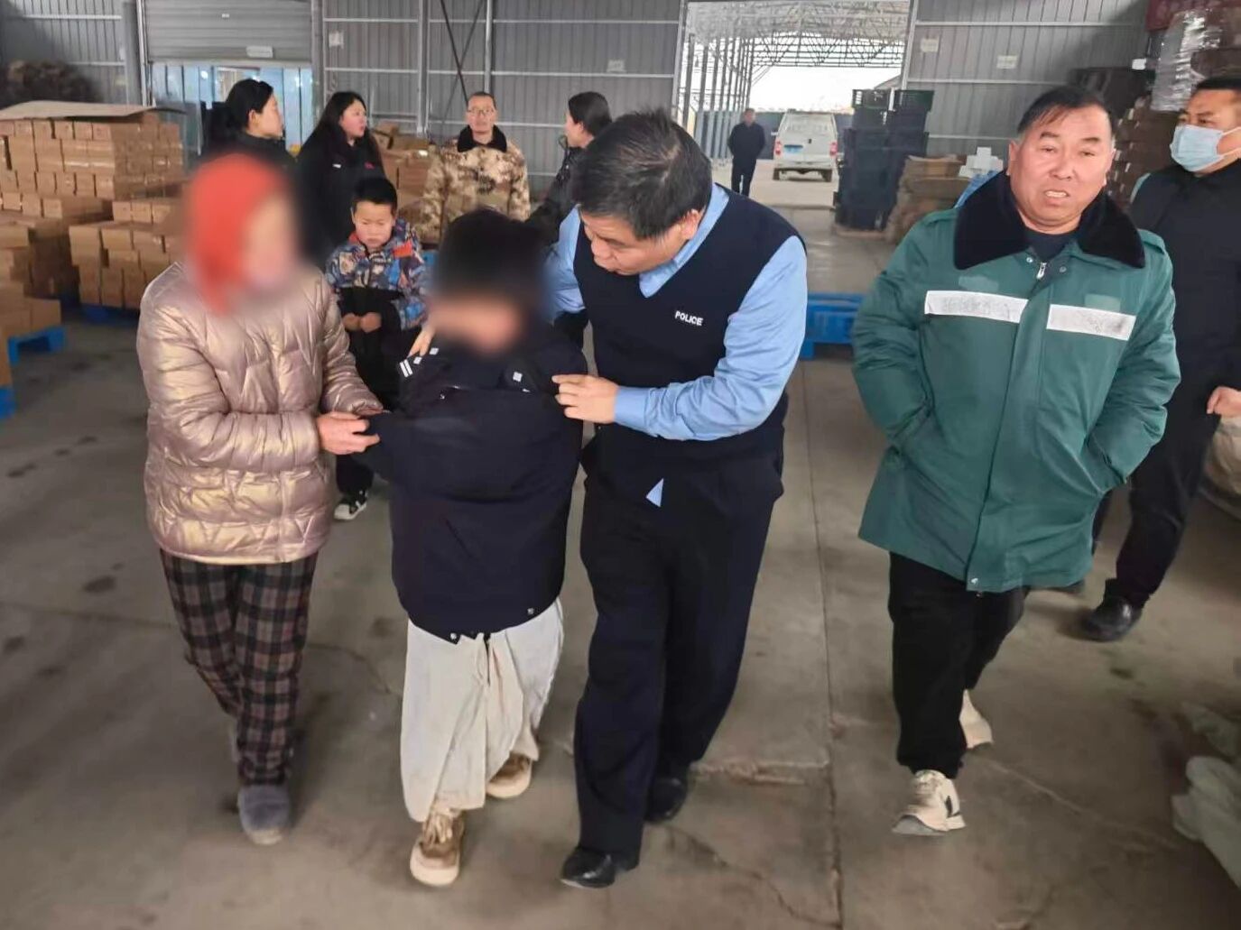 功夫不负有心人,经过近10小时的连续奋战、不懈搜寻,次日清晨,民警终于在一处厂房内的车辆中发现了孩子的身影。当看到孩子平安无恙时,所有人悬着的心终于落下,疲惫与焦灼瞬间被欣慰取代。安仁派出所所长周晓庆当即脱下自己身上的棉衣,小心翼翼地披在孩子身上,将孩子安全护送回家长身边。